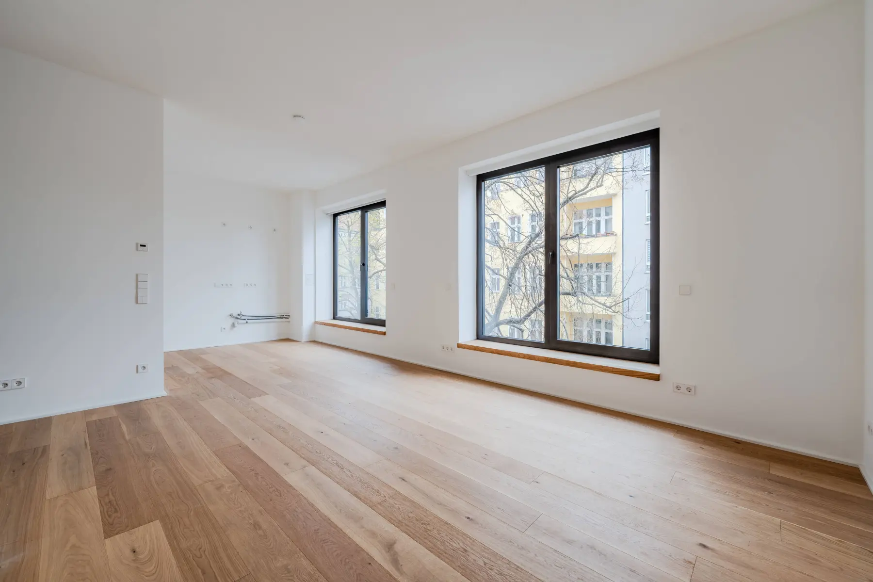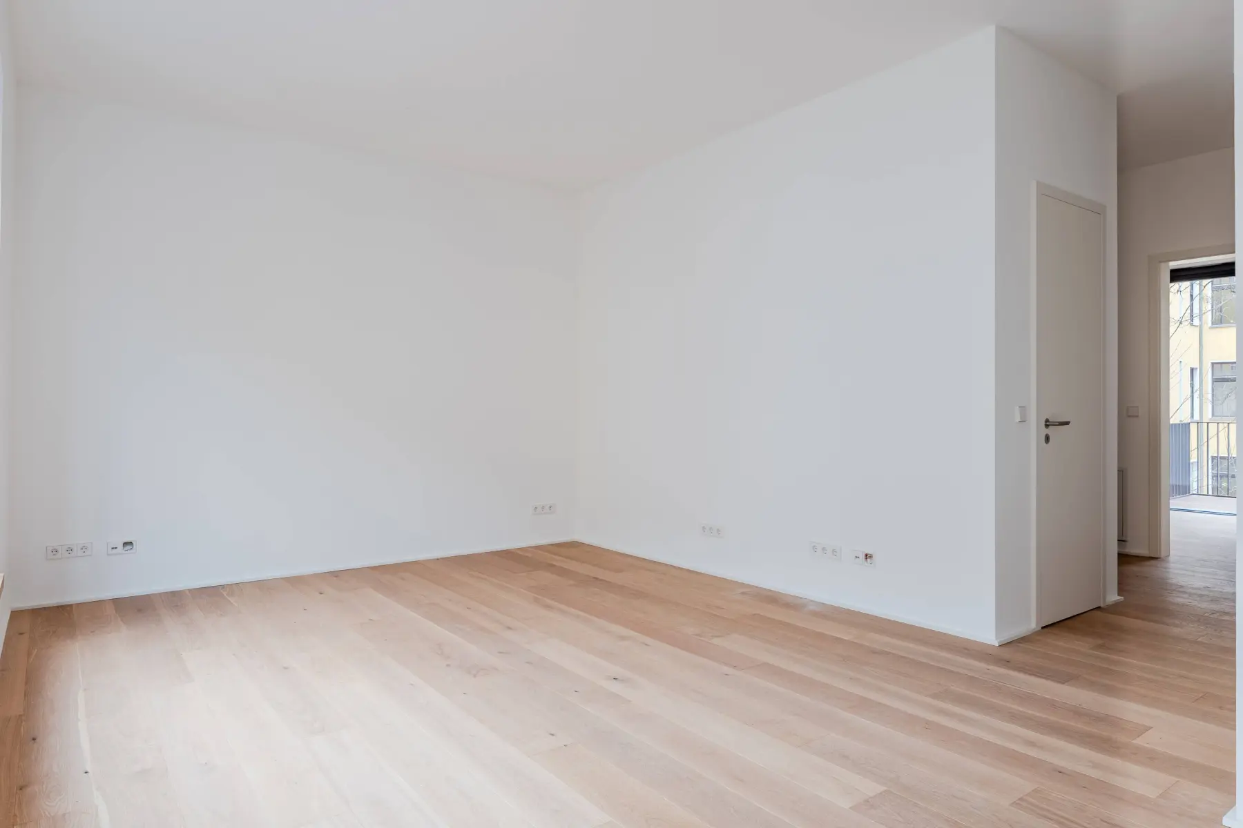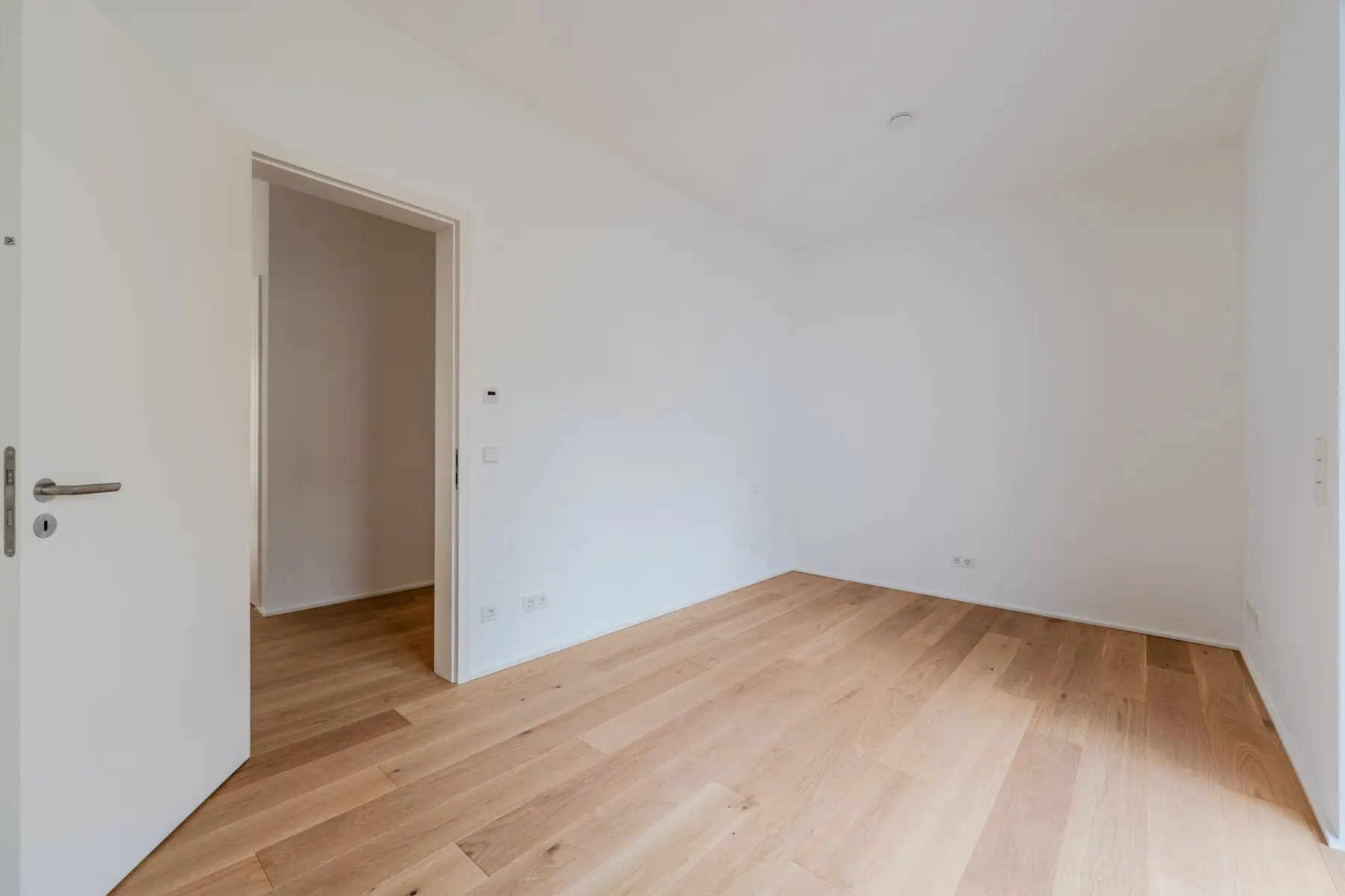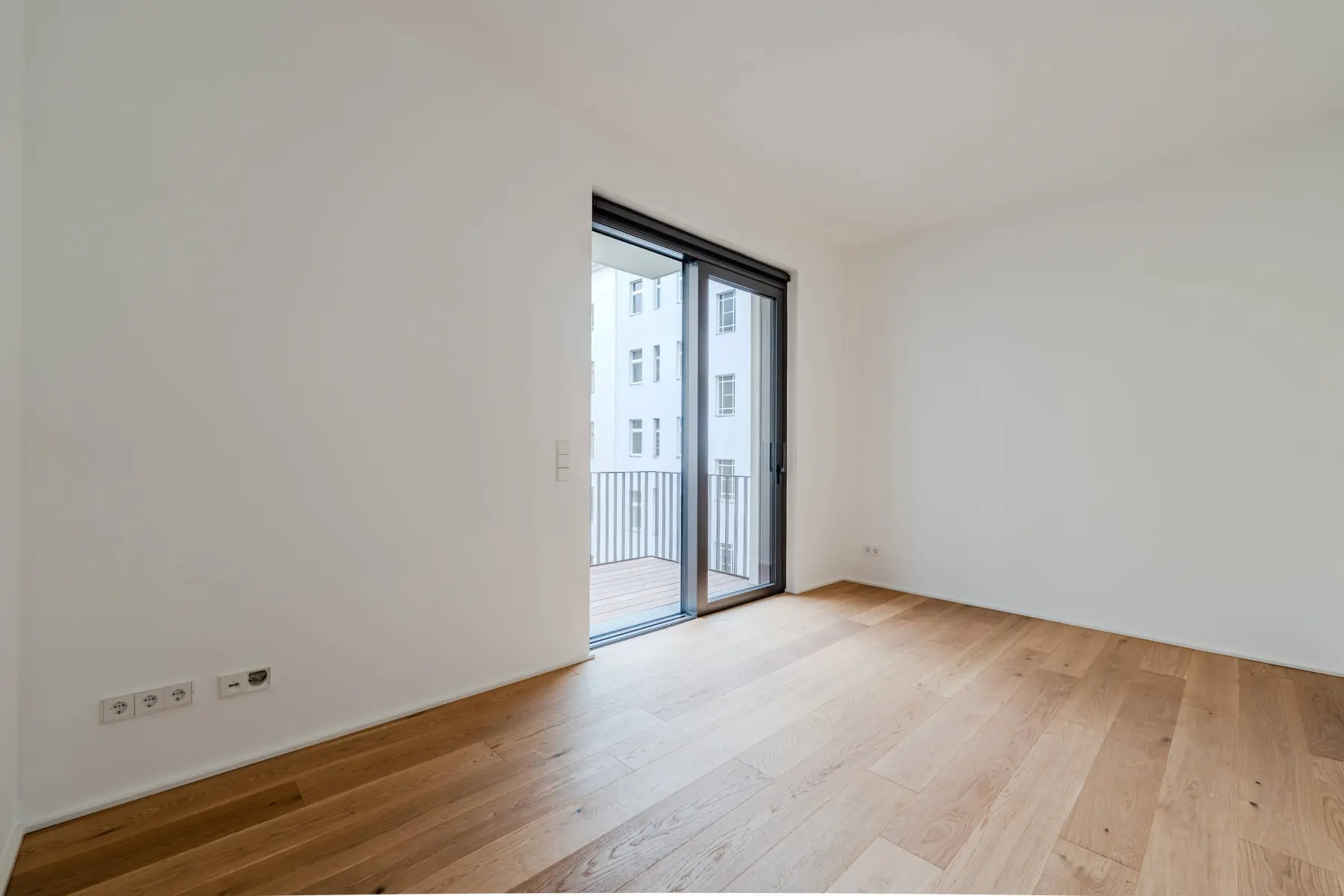 Der offene Wohnbereich bietet viel Raum für eine anspruchsvolle Küchen- und Esslösung und ist mit breiten Eichendielen ausgestattet. Das Schlafzimmer ist zum ruhigen Innenhof orientiert und verfügt über einen direkten Zugang zum Balkon mit Holzbelag und filigranem Stahlgeländer. Das Badezimmer präsentiert sich in warmen Naturtönen und ist mit einer bodengleichen Regendusche ausgestattet. Ein separater Hauswirtschaftsraum dient als funktionale Ergänzung. Die Wohnung ist Teil eines architektonisch anspruchsvollen Neubaus, entworfen von HeimBalp Berlin, mit fünfjähriger Gewährleistung.