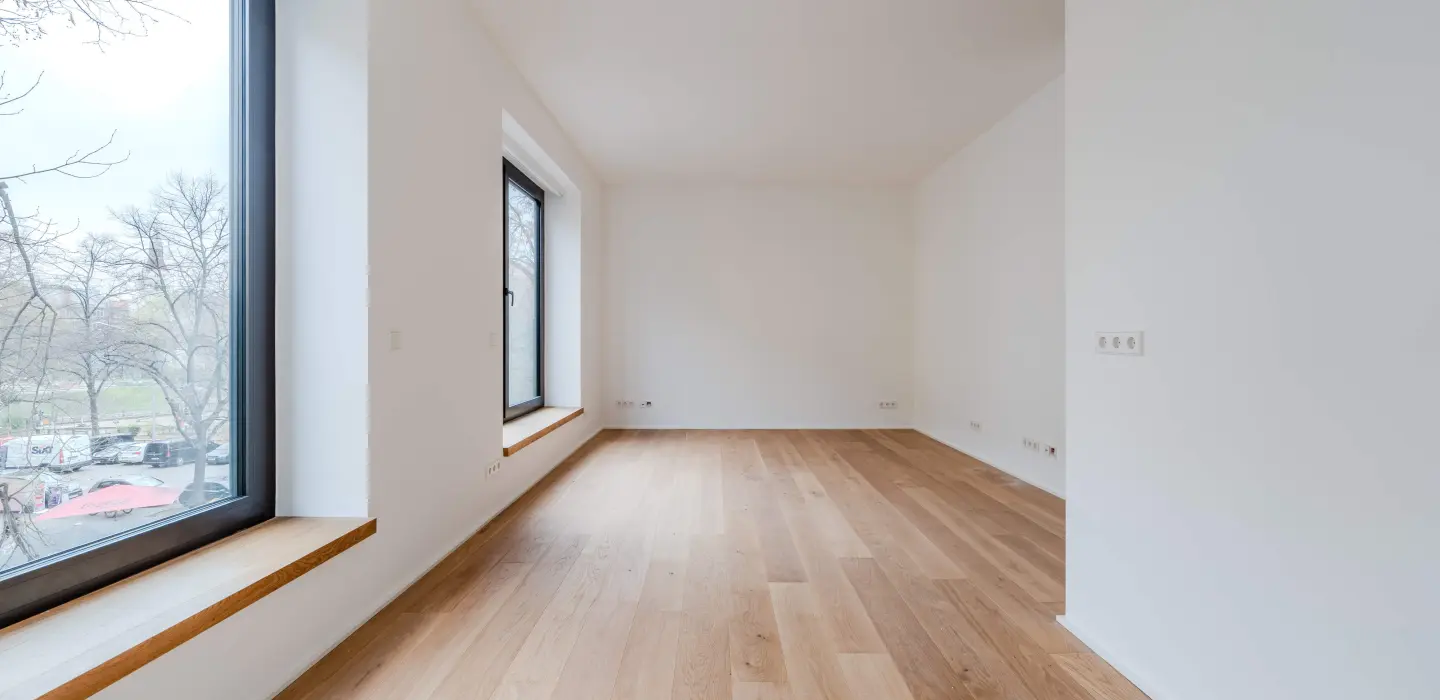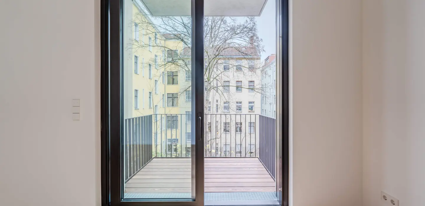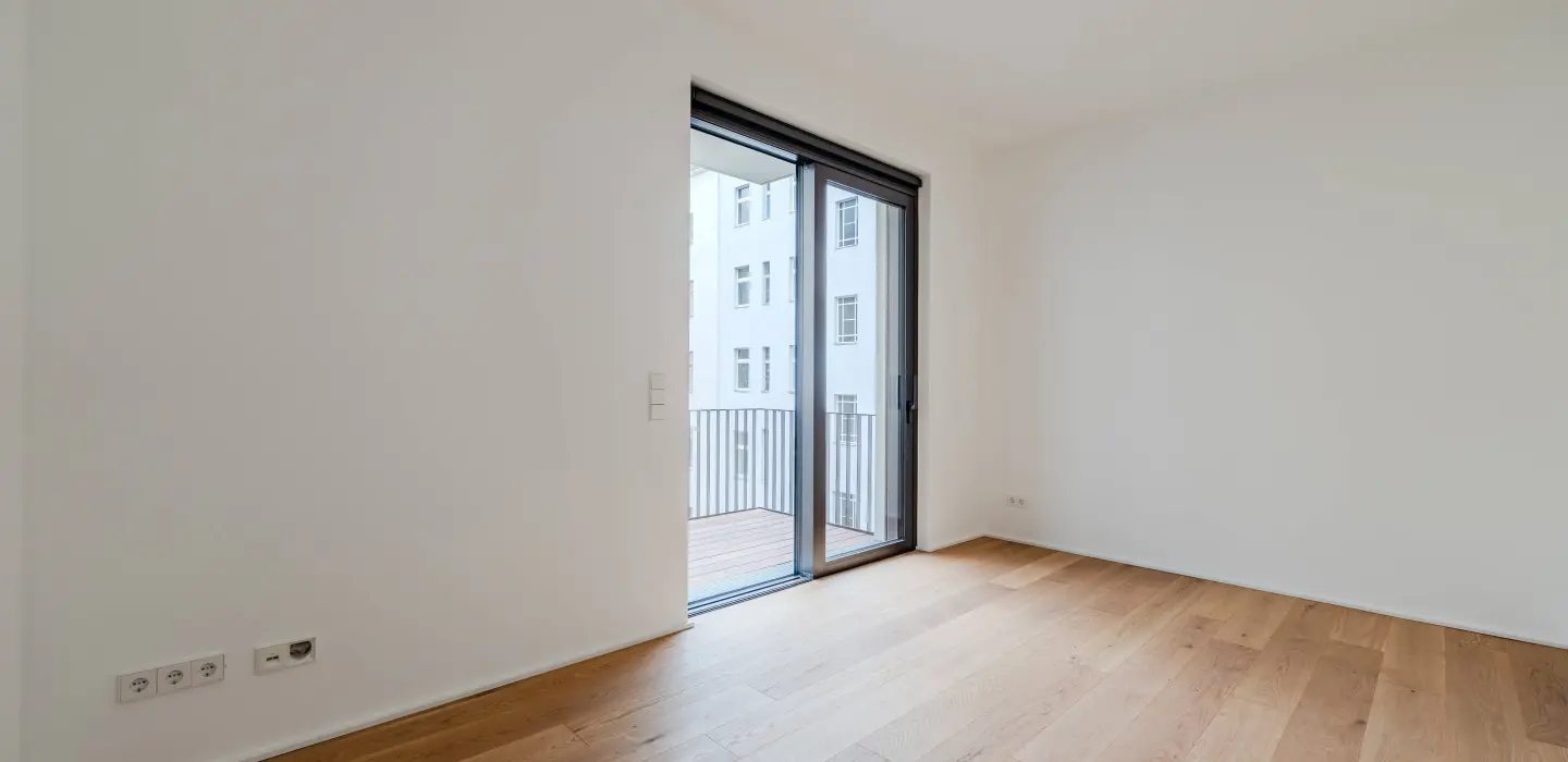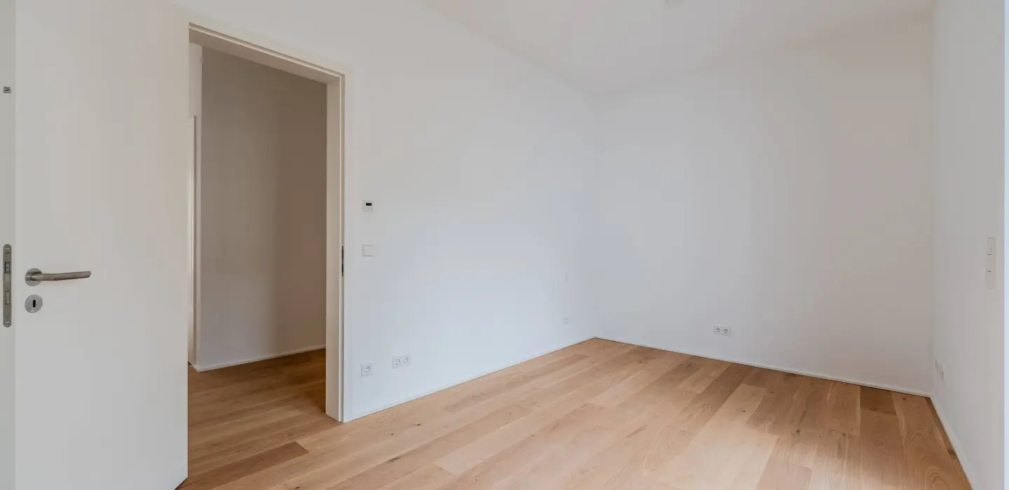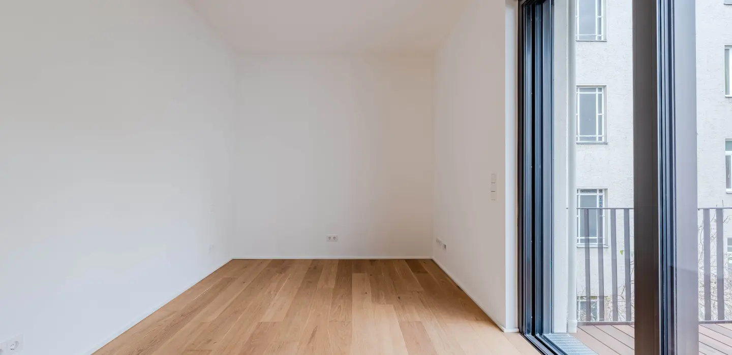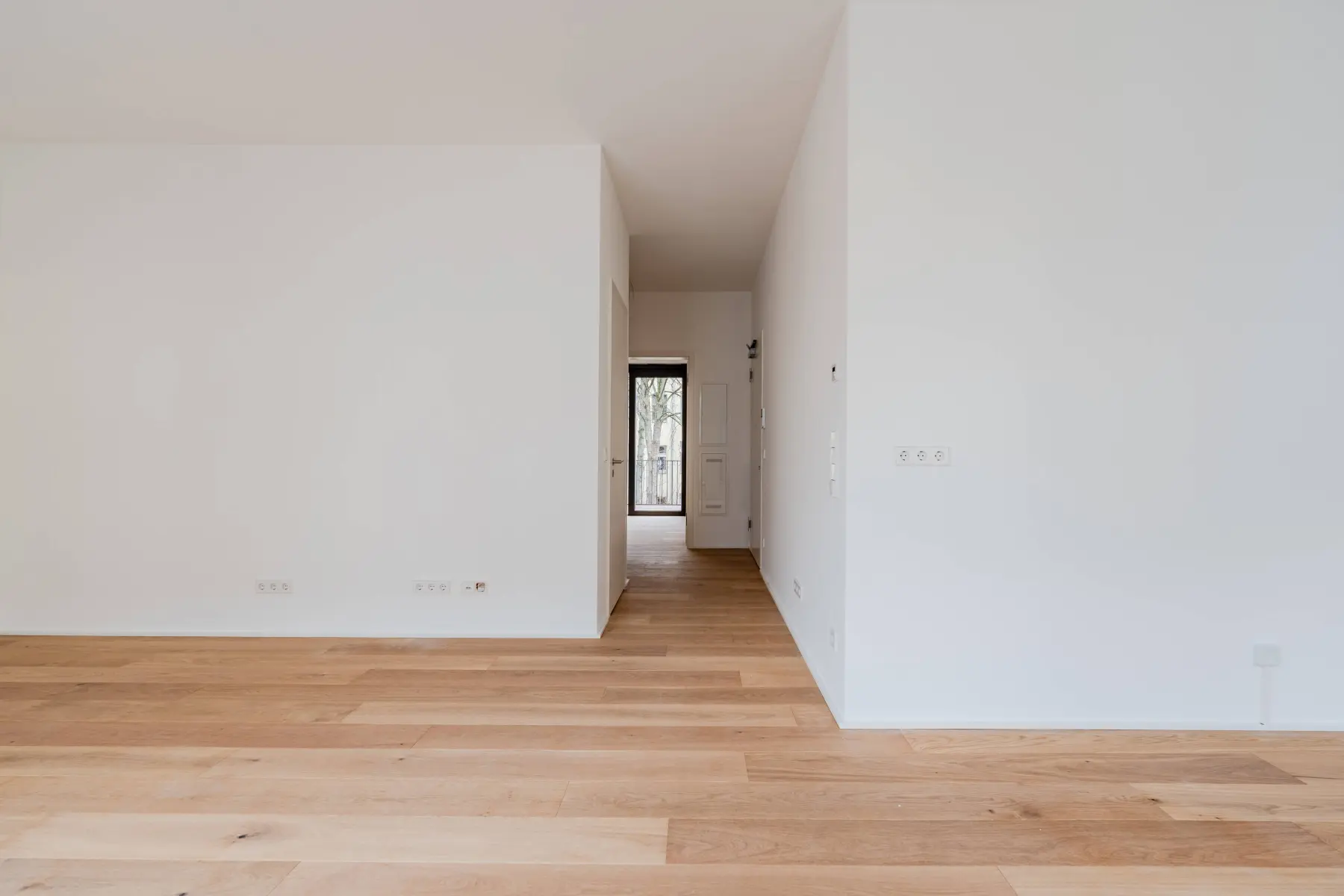Der offene Wohnbereich bietet viel Raum für eine anspruchsvolle Küchen- und Esslösung und ist mit breiten Eichendielen ausgestattet. Das Schlafzimmer ist zum ruhigen Innenhof orientiert und verfügt über einen direkten Zugang zum Balkon mit Holzbelag und filigranem Stahlgeländer. Das Badezimmer präsentiert sich in warmen Naturtönen und ist mit einer bodengleichen Regendusche ausgestattet. Ein separater Hauswirtschaftsraum dient als funktionale Ergänzung. Die Wohnung ist Teil eines architektonisch anspruchsvollen Neubaus, entworfen von HeimBalp Berlin, mit fünfjähriger Gewährleistung.