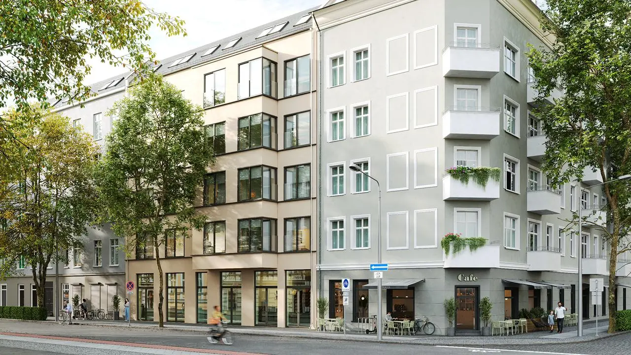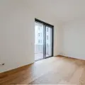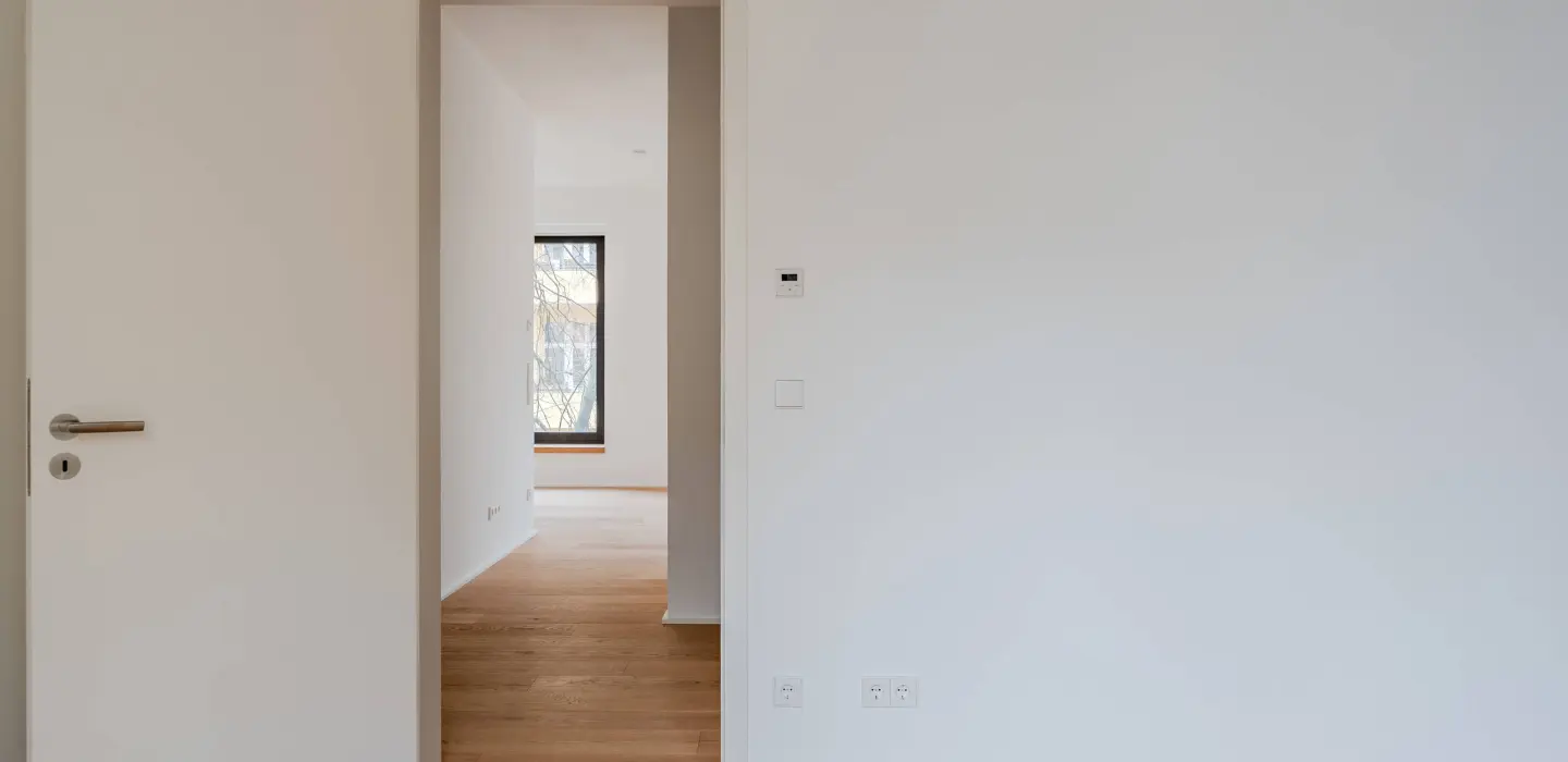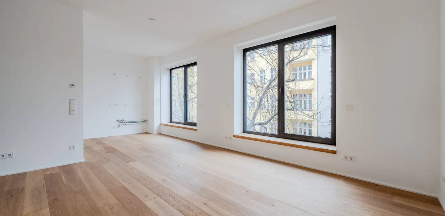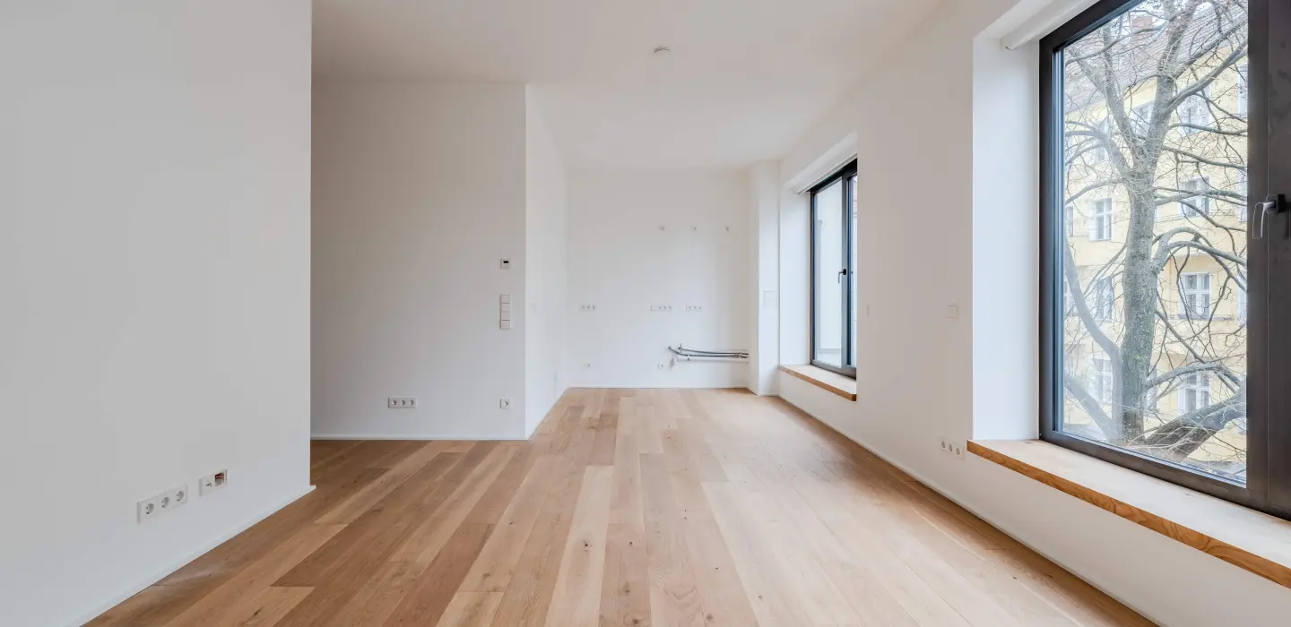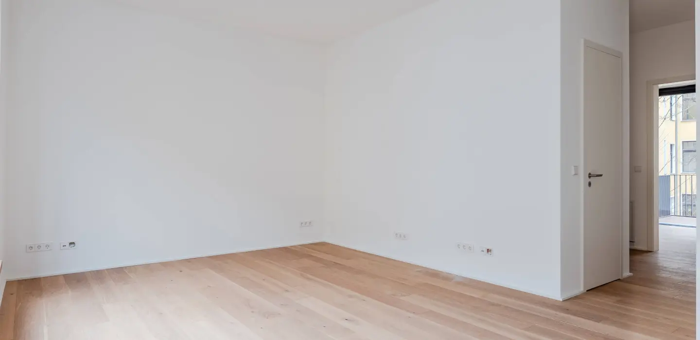 Der offene Wohnbereich bietet viel Raum für eine anspruchsvolle Küchen- und Esslösung und ist mit breiten Eichendielen ausgestattet. Das Schlafzimmer ist zum ruhigen Innenhof orientiert und verfügt über einen direkten Zugang zum Balkon mit Holzbelag und filigranem Stahlgeländer. Das Badezimmer präsentiert sich in warmen Naturtönen und ist mit einer bodengleichen Regendusche ausgestattet. Ein separater Hauswirtschaftsraum dient als funktionale Ergänzung. Die Wohnung ist Teil eines architektonisch anspruchsvollen Neubaus, entworfen von HeimBalp Berlin, mit fünfjähriger Gewährleistung.